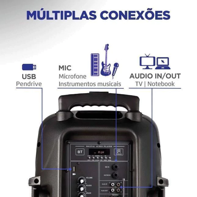 Com múltiplas conexões com entradas usb, sd e aux para conectar Pen Drive, cartão de memória, MP3, MP4.