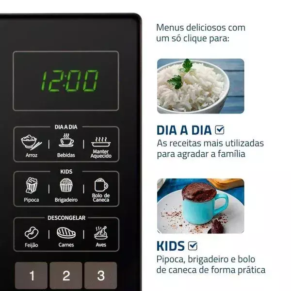 Possui painel digital com funções pré-programadas, facilitando o preparo de alimentos como pipoca, arroz, brigadeiro e descongelamento. Além disso, seu design moderno em preto espelhado combina perfeitamente com qualquer estilo de cozinha.